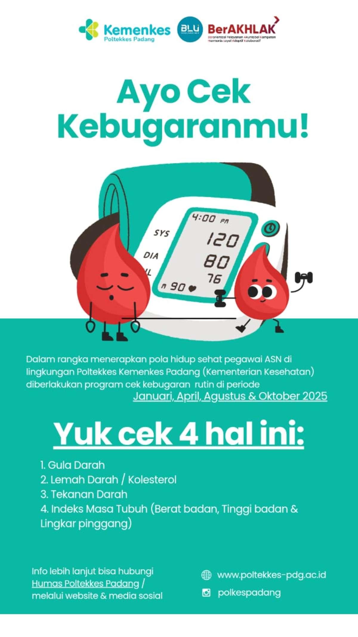 Dalam rangka menerapkan pola hidup sehat pegawai ASN di lingkungan Poltekkes Kemenkes Padang (Kementerian Kesehatan) diberlakukan program cek kebugaran rutin di periode Januari, April, Agustus & Oktober 2025